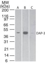 Antibodies that detect DAP3 can be used in several scientific applications, including Western Blot, Immunohistochemistry, Immunocytochemistry, ELISA and Immunoprecipitation. These antibodies target DAP3 in Human, Mouse and Rat samples. Our DAP3 monoclonal and polyclonal antibodies are... Antibodies that detect DAP3 can be used in several scientific applications, including Western Blot, Immunohistochemistry, Immunocytochemistry, ELISA and Immunoprecipitation. These antibodies target DAP3 in Human, Mouse and Rat samples. Our DAP3 monoclonal and polyclonal antibodies are developed in Mouse, Rabbit... Antibodies that detect DAP3 can be used in several scientific applications, including Western Blot, Immunohistochemistry, Immunocytochemistry, ELISA and Immunoprecipitation. These antibodies target DAP3 in Human, Mouse and Rat samples. Our DAP3 monoclonal and polyclonal antibodies are developed in Mouse, Rabbit and Goat. Find the DAP3 antibody that fits your needs. Choose from 1 of 29 DAP3 antibodies, which have been validated in experiments with 2 publications and 68 images featured in our data gallery.