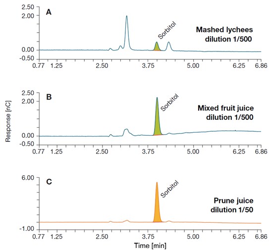 To evaluate the effectiveness of modern HPAE-PAD systems for polyol analysis, we used a Dionex ICS-6000 HPIC system equipped with a Dionex CarboPac PA300-4μm column to determine sorbitol concentrations in fruit and beverage samples.