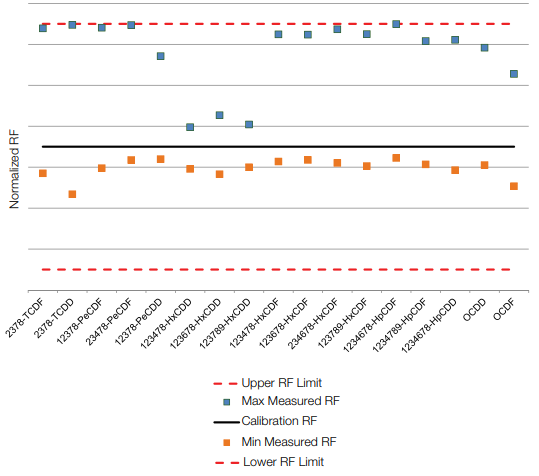 Across the 63 injections studied (which included 21 matrix samples, 11 blanks and 31 standard injections) response factors and ion ratios for all native congeners in each sample demonstrated consistent compliance with EU regulations and maintained a high level of sensitivity to meet the required LOQs (Figure 1). The lowest calibration standard amount was adjusted for sample weight and toxicity equivalency factors. Results were five times lower than regulatory requirements, validating the analytical system as not only sufficiently sensitive for routine dioxin testing, but also allowing for user flexibility and variability in sample weight if needed.