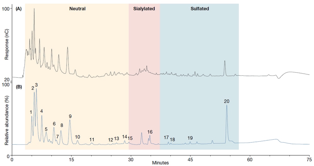 High-performance anion-exchange (HPAE) chromatography coupled with pulsed amperometric detection (PAD) and mass spectrometry (MS) is a well-established and powerful technique for glycan analysis. HPAE is capable of highly selective glycan separations using strong anion-exchange column chemistries, while PAD and MS enable direct quantification of analytes, eliminating the need for time-consuming sample derivatization steps.