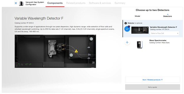 The next step is to choose one to two detectors and any required components like flow cells. We have two detector options available — variable wavelength or mass spectrometer — and the type of detector you select should complement the complexity of your separations.