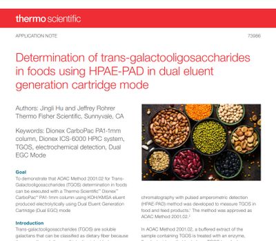 High-performance anion-exchange (HPAE) chromatography coupled with pulsed amperometric detection (PAD) is a well-established technique for oligosaccharide analysis. Given the reliability and widespread use of this analytical approach the AOAC, a standards-setting organization approved a HPAE-PAD-based protocol (AOAC Method 2001.02) for the determination of TGOS content in food and feed products. In this method, TGOS present in a buffered sample extracts are first hydrolyzed to galactose and glucose using β-galactosidase, before being separated by HPAE using a Thermo Scientific™ Dionex™ CarboPac™ PA1-4mm column and subsequently detected by PAD.