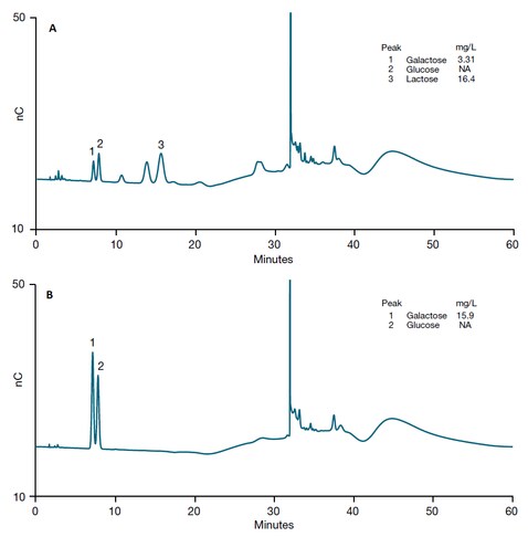 Calibration curves with seven concentration levels were constructed for galactose and lactose. The coefficient of determination (r2) was greater than 0.999 for each component, highlighting the linearity of this approach. Method precision was then assessed by triplicate injection of a calibration standard. The calculated peak area precision ranged from 0.66–1.23%, with retention time precision of <0.21% for all target carbohydrates. The excellent precision of this approach is characteristic of a system operating in dual EGC mode.
