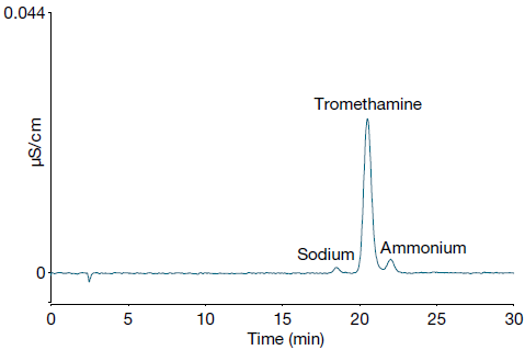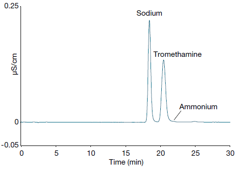 To demonstrate the benefits of this new assay, we highlight the effective separation of tromethamine. Using the Dionex IonPac CS20 column under isocratic elution, good separation of tromethamine from the nearest cations (sodium and ammonium) was achieved in just 30 minutes (Figure 1).
