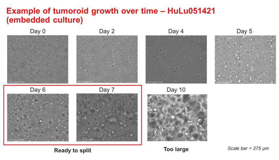 - Optimal diameter for passaging: We recommend passaging when the diameter of large tumoroids in the culture is 100–300 µm (typically every 6-10 days, though some cultures may be split in the 5–14 day window). Most tumoroid lines reach diameters of 200-300 µm when ready for subculturing, though some lines may only grow to ~100 µm in diameter. Passaging too early can negatively impact viability and lead to excessive dissociation into single cells, which increases the risk of anoikis. Delaying passaging can result in necrotic core formation, ineffective dissociation, metabolic waste buildup, and eventual culture crash. The tumoroids in the image below are representative of the variations in morphology that can occur within a given cancer indication, in this case colorectal cancer.
