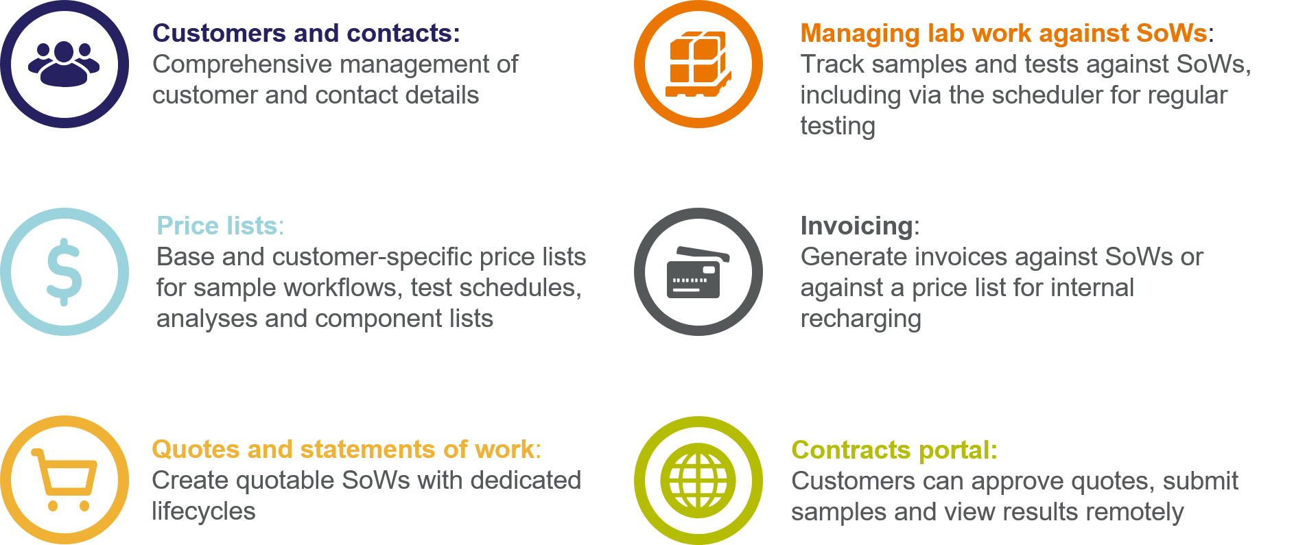 - Contract labs can easily manage customers, work, pricing and invoicing, and provide their clients with a secure portal to access requests and results.