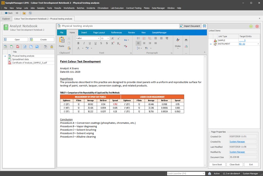 The ELN adds to the already rich capabilities of the SampleManager LIMS software suite, integrating with the existing LIMS, lab execution system (LES) and scientific data management system (SDMS). The notebook supports the storage of unstructured data and molecular structures, enabling analysts to store and search for supplementary information against entities in SampleManager LIMS software. The ELN features: