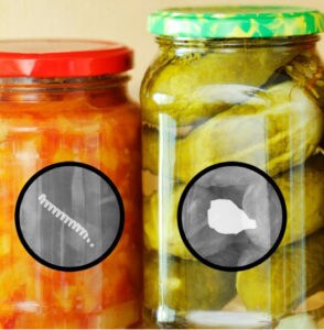 X-ray inspection systems used in food manufacturing are based on the density of the product and the contaminant. X-rays are simply light waves that we can’t see. X-rays have a very short wavelength, which corresponds to very high energy. As an X-ray penetrates a food product, it loses some of its energy. A dense area, such as a contaminant, will reduce the energy even further. As the X-ray exits the product, it reaches a sensor. The sensor then converts the energy signal into an image of the interior of the food product. Foreign matter appears as a darker shade of grey and helps identify foreign contaminants, like the stone in the pickle jar in the photo below. The higher density of contaminant, the darker it appears on the X-ray image.