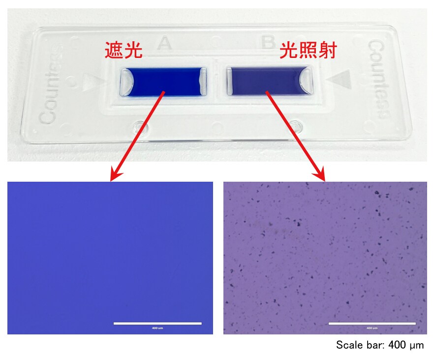 光照射後のトリパンブルー溶液をそれぞれInvitrogen™ Countess™ Cell Counting Chamber Slide(製品番号:C10228)に注入し、溶液の見た目を確認しました(図2上段)。その結果、遮光した溶液の色はクリアなブルーでしたが、光照射した溶液は薄い紫色に変色していました。次に、それぞれの状態を位相差顕微鏡(10倍対物レンズを使用)で観察しました(図2下段)。遮光した溶液中には沈殿は見られませんでした。一方、光照射した溶液には多数の沈殿が生じており、液体部分の色が薄まっていることが見てとれました。この結果から、光がトリパンブルーの沈殿形成を促進することが確認できました。