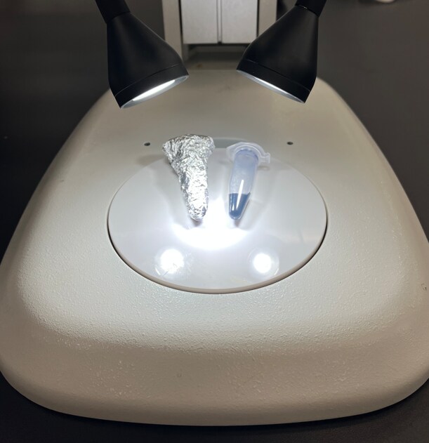 今回も当社のトリパンブルー溶液(Gibco™ Trypan Blue Solution, 0.4%/製品番号:15250061)を使用しました。シリンジフィルター(Thermo Scientific™ Nalgene™ 25mm Syringe Filters, PES, 0.2μm pore size, Sterile/製品番号:725-2520)でろ過して沈殿を除去したトリパンブルー溶液を2本の1.5 mLチューブに小分けし、そのうち1本をアルミホイルで全体を包み、完全に遮光しました。そして、この2本のチューブを白色LED光源の下に設置し、約8時間の照射を3回(合計約24時間)行いました(図1)。