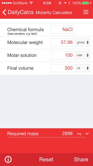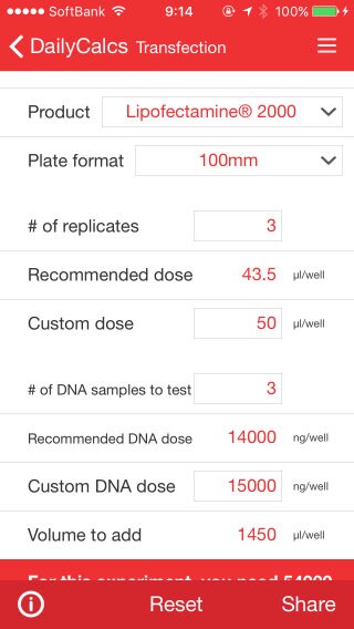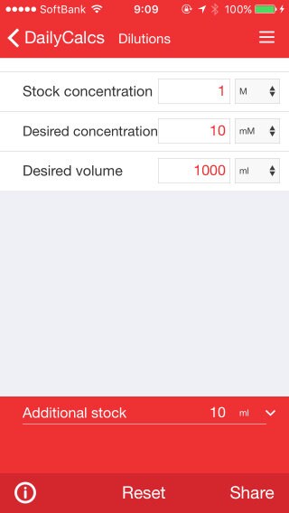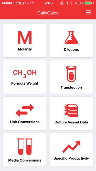 日々の実験で使用する試薬を作るのに、モル濃度計算、希釈計算、単位換算など、面倒な計算が多く、特に普段定期的に使っていないと忘れてしまったり、非常にストレスがかかる作業ですよね?こんなときに便利なiPhoneアプリをご用意しました。弊社のモバイルアプリ「DailyCalcs」を使うことで、お手持ちのiPhoneをアーミーナイフのような実験用電卓に変えて、ラボの日常業務を簡単にできます!今回は、この便利なアプリ「DailyCalcs」の実験に役立つ8つの機能をご紹介します。