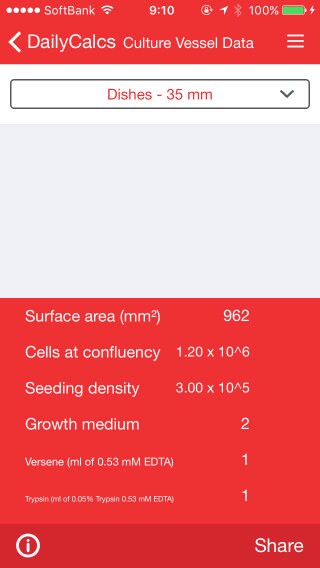 Culture Vessel Dataでは、細胞培養ディッシュやプレート、フラスコそれぞれの培養表面積、細胞播種密度、コンフルエントの細胞密度、増殖培地の必要量はもとより、必要なバーゼン液やトリプシンの液量まで、この記事を見るよりも早く、瞬時に細胞培養に必要な数値を表示できます。