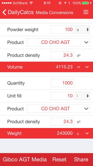 Media Conversionsツールは、Gibco™ブランドの粉末培地やAGT培地製品をキログラムとリットルで変換する培地作成用の単位変換ツールです。