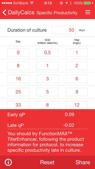 Specific Productivityツールは、微生物や動物細胞の培養法のひとつである流加培養において、培養時間(日)、生細胞密度および力価から、比生産速度を算出できるツールです。