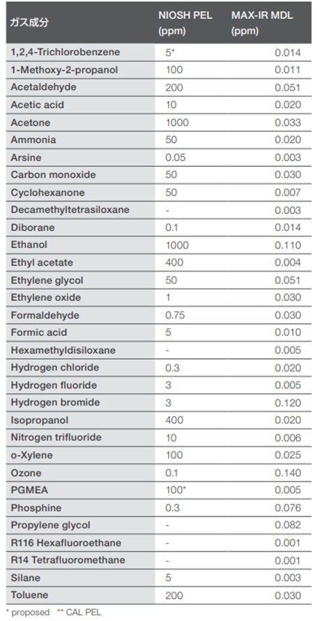 ここでは、MAX-iAQシステムが多数の大気汚染物質を適切なレベルでモニタリングできる能力を評価するために、実験室の周囲の空気を15秒間隔で1時間連続測定しました。特定の分析条件によりモニターされた化合物の結果を表1に示します。各化合物の最小検出限界(MDL)は、1時間のデータの標準偏差の3倍と定義しました。これらのMDLはNational Institute for Occupational Safety & Health(NIOSH)が公表する許容暴露限界値(PEL)と比較し、PELを大きく下回っており、MAX-iR FTIRガスアナライザーが実用限界付近で要求される精度を満たしているか、或いは上回っていることを意味しています。