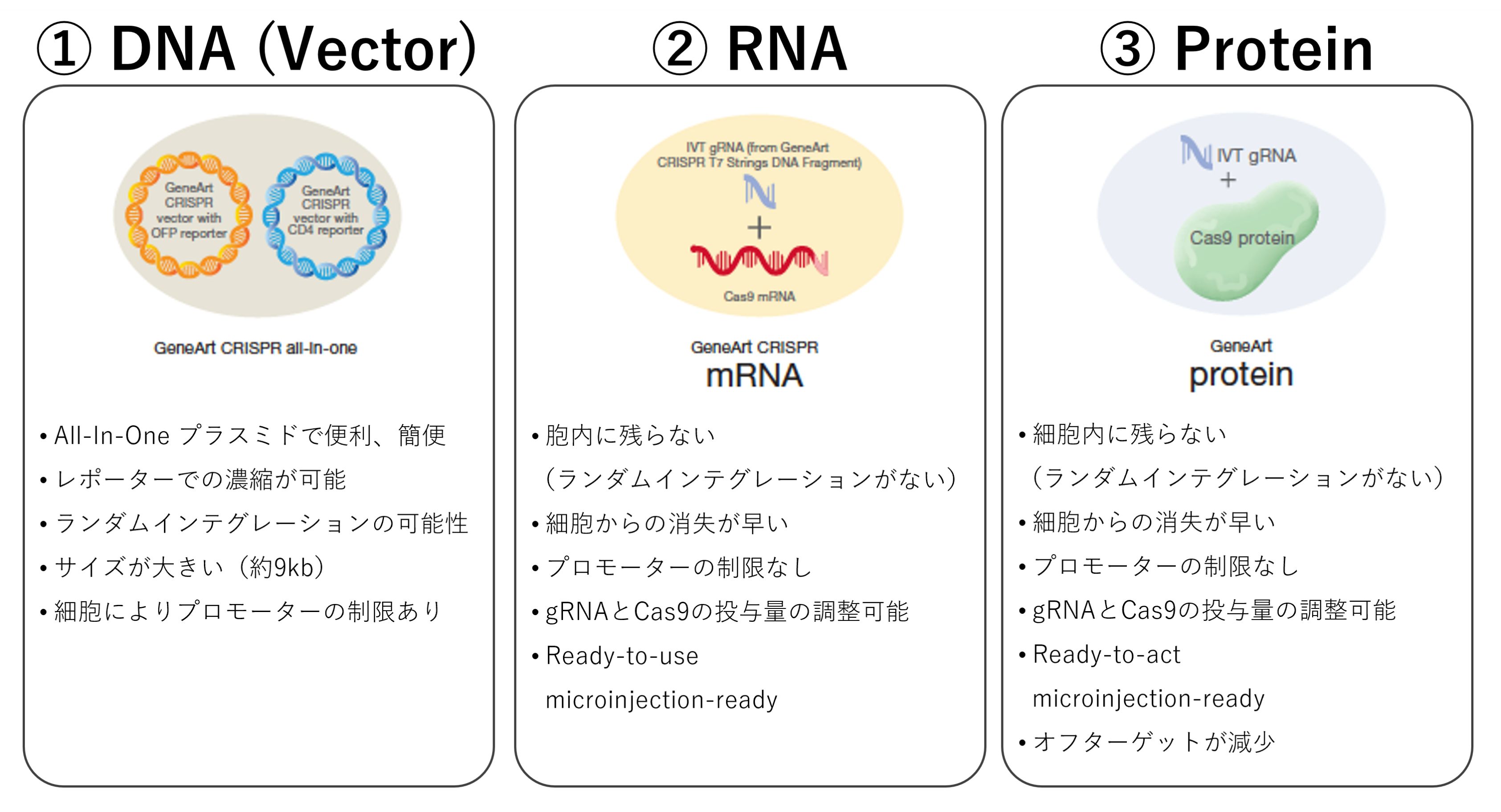 供与方法、つまり「Cas9とガイドRNAをどうやって細胞に与えるか」には、3つ方法があります。実験を行う前に、この3種類のどの方法で実施するか、選択しておきましょう。