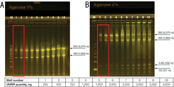 次に、universal human reference RNA(UHRR)を用いてtotal RNAの泳動条件を検討した例をご紹介します(図2)。RNA量が250~4,000 ngの10パターンになるようにし、1%と2%のゲルにアプライしました。変性処理はホルムアミド添加のみで熱処理は行っていません。