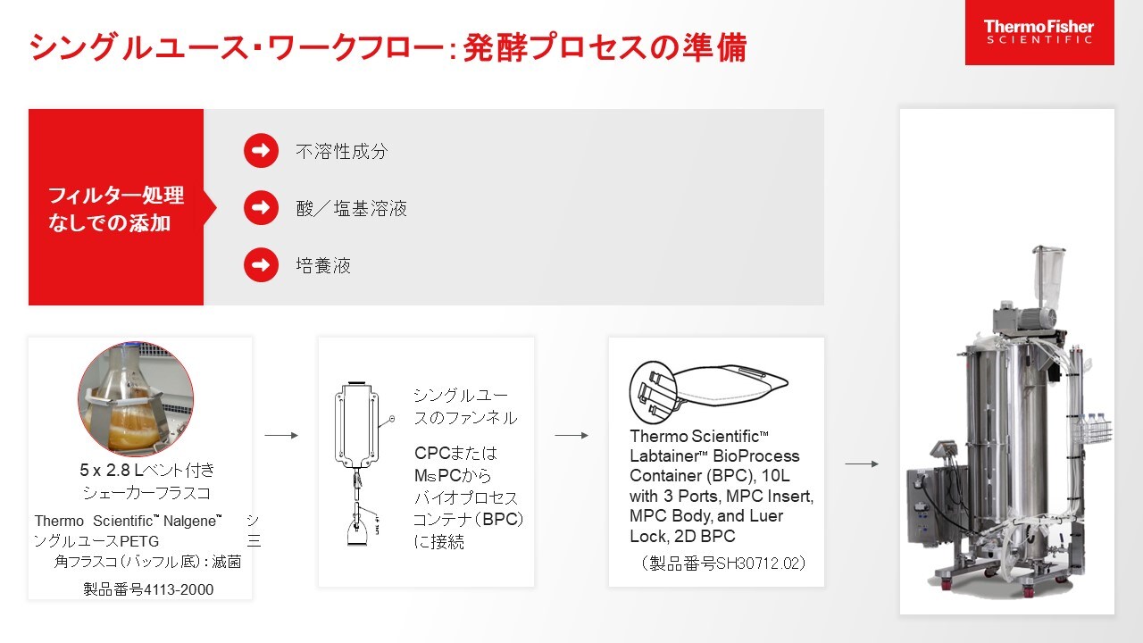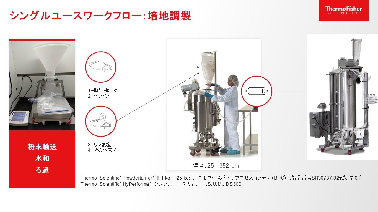 ここからは実際のワークフローを紹介します。まず、培地調製を行います。粉末培地を粉末用シングルユースバッグThermo Scientific™ PowderTainer™に量りとり、シングルユースミキサーに溶媒となる水とともに投入します。粉末培地が完全に溶解するまで撹拌後、フィルター濾過してシングルユースファーメンターへ移します。