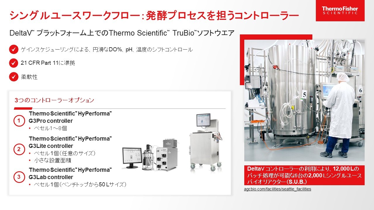 実際の発酵プロセスにおいて、温度やpH, DOなどの制御を担うのはコントローラーです。HyPerforma シングルユースファーメンター向けのコントローラーとしては、こちらに示す3つのオプションがあり、いずれもDeltaVプラットホーム上でワークするThermo Scientific™ TruBio™ソフトウエアを搭載しており、溶存酸素濃度やpH、温度を細かく制御することができます。最も規模が大きいものはThermo Scientific™ HyPerforma™ G3Pro controllerで、GMP施設向けに設計されており、大型のリアクターや、複数台のリアクターの制御が可能です。Thermo Scientific™ HyPerforma™ G3Lite controllerはパイロットスケールに適しており、G3Pro controllerよりも小さなフットプリントで設置が可能です。HyPerforma G3 Labはその名の通り、研究室にも設置できるようにコンパクトに設計されており、Thermo Scientific™ HyPerforma™ベントトップ型ガラス製バイオリアクターから50 LのThermo Scientifc™ DynaDrive™シングルユースバイオリアクターまでを制御できるコントローラーです。いずれも同じインターフェースを使用しているので、研究開発から商用規模までHyPerformaのコントローラーを使用することでスムーズなスケールアップが可能になります。