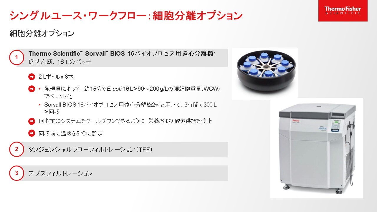 続いて、微生物発酵終了後の回収工程で使用する遠心分離機のご紹介です。Thermo Scientific™ Sorvall™ BIOS 16バイオプロセス遠心分離機は低せん断で一度に16 Lを処理することができます。菌体量にもよりますが、おおよそ15分でペレット化することができます。300 Lの培養液がある場合、2台稼働させると約3時間で全量の回収が可能です。