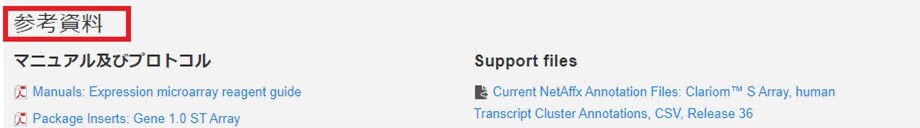 ヒト用Clariom Sの製品ページを開いたら、ページ中ほどの「参考資料」の位置までスクロールしてください。