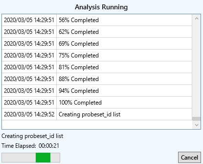 N数や群数、またパソコンのスペックにもよりますが、Clariom SでN=3、4群のサンプルデータの解析では、約45秒~2分程度で解析が終了します。
