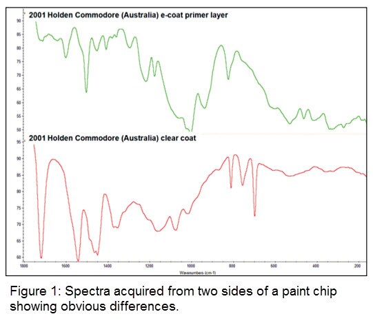 Fourier Transform Infrared (FTIR) spectroscopy is a techniques used extensively to characterize the chemical composition of trace evidence such as paints, fibers and adhesives as well as related chemicals. When IR radiation is passed through a sample, some radiation is absorbed by the sample and some passes through (is transmitted). The resulting signal at the detector is a spectrum representing a molecular ‘fingerprint’ of the sample. The usefulness of infrared spectroscopy arises because different chemical structures (molecules) produce different spectral fingerprints. And different paints have different fingerprints.
