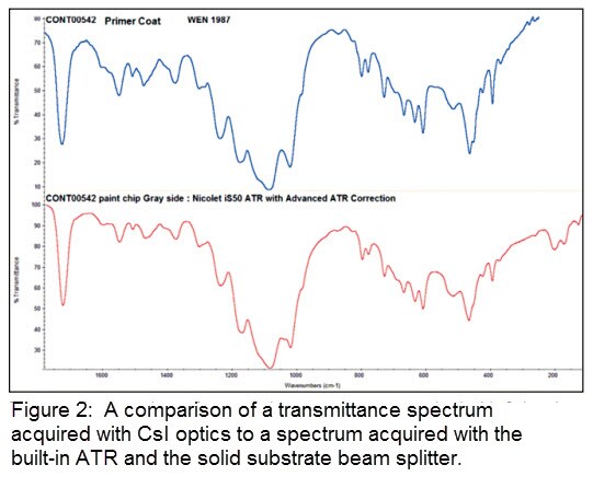 A spectrum acquired with the extended range, built-in ATR from a second paint chip is compared to the corresponding transmission spectrum. Although both the sample preparation and measurement methods were different, the spectra are quite similar after applying a software-based advanced ATR correction function. In addition, the ATR spectrum shows a few significant features below the 220 cm-1 cutoff of the transmittance spectrum acquired with CsI optics.