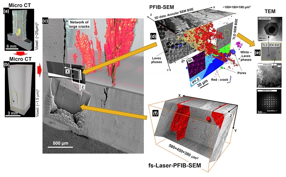 Take an additively manufactured Inconel 718 test component for aero engines, for example. Researchers may want to use a 3D micro X-ray computed tomography to inspect large defects, cracks and component imperfections to examine nondestructively its morphology and define locations for further investigations with different apparatus. Using DualBeam or TriBeam systems (FIB-SEM, PFIB-SEM, fs-Laser-PFIB-SEM) they can explore in 3D the alloy’s microstructure and composition at much greater resolutions. Furthermore, with the help of a transmission electron microscope (TEM), they can examine a tiny region of interest at atomistic resolution, such as the tip of a crack. Researchers can also process and visualize their images using image processing software such as Avizo Software. Utilizing multi-scale correlative imaging in this way, researchers are making the small improvements needed to create alloys of the future.