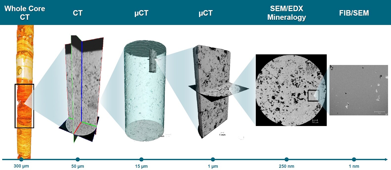 Multi-scale imaging of a Middle Eastern carbonate sample. Data courtesy of Masdar Institute of Science and Technology.