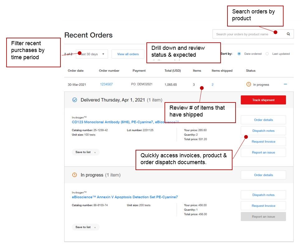 Find what you need fast. Easily check the status of an order, anticipated delivery dates, or the status of a specific shipment. Search by product name to pinpoint orders that include the product to easily reorder or check status.