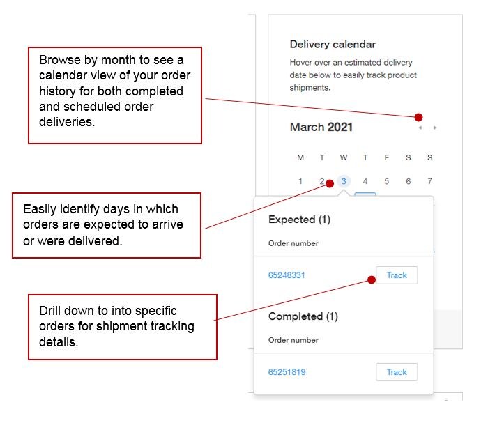 Account Delivery Calendar (US, CA, UK, Germany, Austria and Switzerland only). Use the Delivery Calendar as another means to quickly see the dates on which you are expected to have orders delivered.