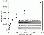 WesternDot fluorescently labeled secondary antibodies deliver superior signal-to-noise ratios and exhibit comparable sensitivity to enhanced chemiluminescence (ECL)-based methods in western blot applications. No stripping and re-probing or multiple blots are required for multiple protein detection as commonly needed with ECL or colorimetric detection. Differently labeled WesternDot antibodies can be applied to a single blot for simultaneous detection of multiple proteins using standard gel or blot imaging platforms (a list of instruments that are compatible with WesternDot detection can be found in the user manual below). Our WesternDot antibodies utilize Qdot nanocrystals enhanced with VIVID technology, making them brighter than the original Qdot reagents. Additionally, they have reduced intensity differences between the different colors, simplifying multiplex applications.