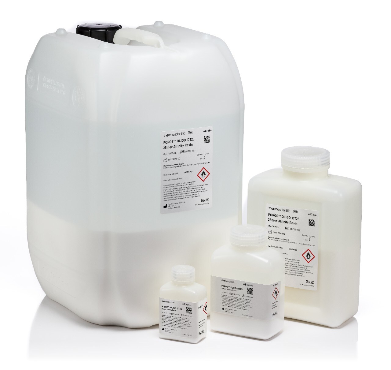 The rapid evolution of mRNA-based vaccines has led to a need for scalable purification solutions which can be used in commercial manufacturing. POROS Oligo (dT)25 affinity resin was developed to address the selectivity and capacity requirements for large-scale purification of mRNA constructs from in vitro transcription (IVT) processes.