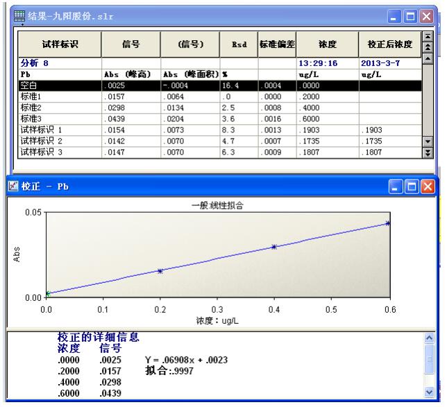2)定量分析结果(0.2ug/L Pb标准溶液测定结果 )