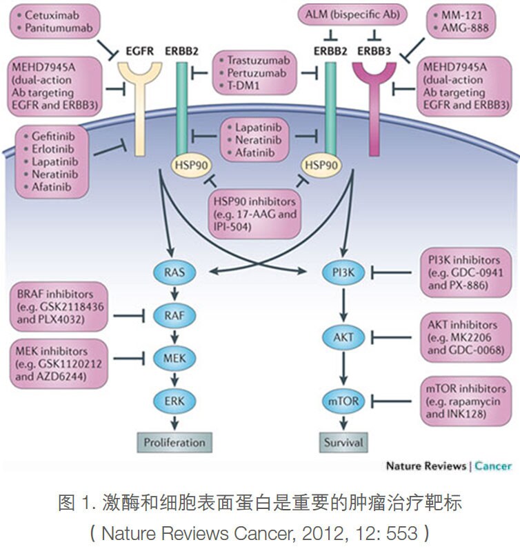 绝大多数的药物治疗靶标都是蛋白质,例如肿瘤靶向药物多为激酶抑制剂,作用靶标为肿瘤信号通路中的激酶;抗体药物和细胞治疗多针对肿瘤细胞表面受体/ 抗原,介导免疫反应和细胞毒性(图 1)。