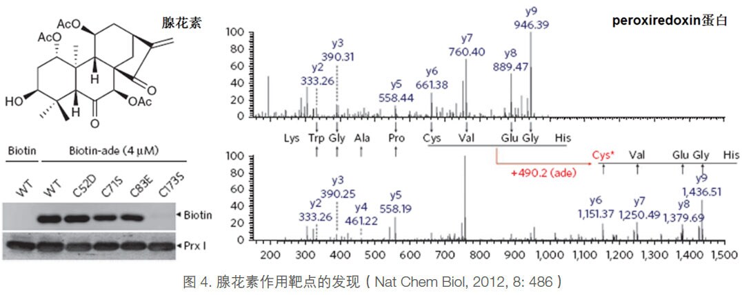 通过蛋白质组学发现并确定药物作用的靶点蛋白,研究药物机理,为进一步新药研发创制奠定基础。如,腺花香茶菜中提取的腺花素(Adenanthin)能够诱导白血病细胞分化,通过高分辨质谱发现其作用靶点是过氧化还原酶(peroxiredoxin)I/II,阐释了白血病细胞分化的新机理(图4)。