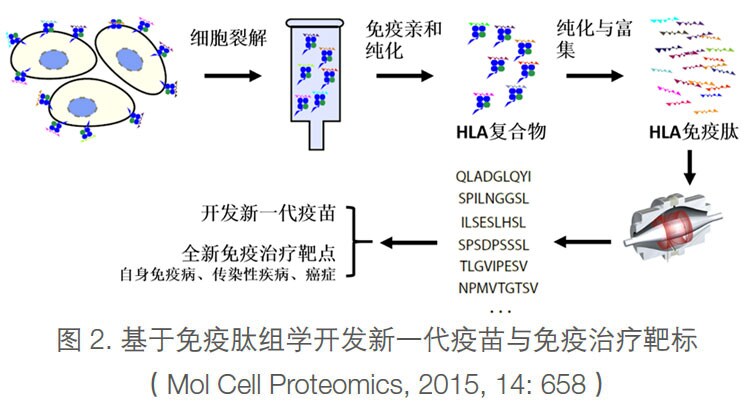 基于Orbitrap 超高分辨质谱的蛋白质组分析是高通量发现潜在治疗靶标的利器。2015 年启动的人类免疫肽组学计划(HIPP, https://www.hupo.org/Human-Immuno-Peptidome-Project),即致力于使用蛋白质组学手段,收集并测定人细胞表面MHC-I 与MHC-II(或称HLA)呈现的所有肽段序列,更透彻地理解免疫系统,指导并加快下一代疫苗的开发和自身免疫病、传染性疾病、癌症免疫治疗方案的开发(图2)。