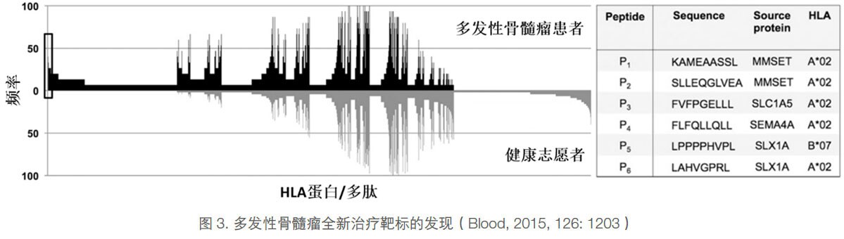 通过蛋白质组学发现并确定疾病特异的信号通路蛋白、细胞表面受体/ 抗原,作为潜在的治疗靶标,开发新药或新的治疗方法。如,对比多发性骨髓瘤患者与健康人细胞表面的HLA 蛋白/ 多肽,发现了多种肿瘤特异性HLA 蛋白/ 多肽,并成功验证了6 个多肽会使T 细胞响应,是潜在的T 细胞免疫治疗的候选抗原(图3)。