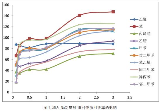 氯化钠具有提高溶液的离子强度,降低有机化合物在水 中溶解度的作用。通过加入 NaCl 起到盐析作用,从而提 高各种有机物的挥发 , 当达到最大挥发程度时,此时各 种分析物可以达到一个较高的灵敏度,本实验考察加入 0.5、1.0、1.5、2.0、2.5 g NaCl 对各种物质响应的影响, 实验结果表明,当加入 2.0 g NaCl 时回收率达到最高 , 其 中乙醛的响应与氯化钠的加入无关。另外实验结果显示, 增加 NaCl 的含量 , 对乙醛的影响不大 , 其主要原因可能 是因为其本身在水中的溶解量很少。