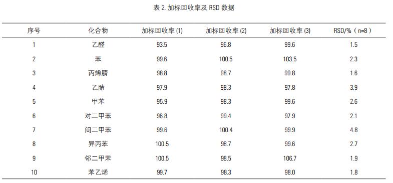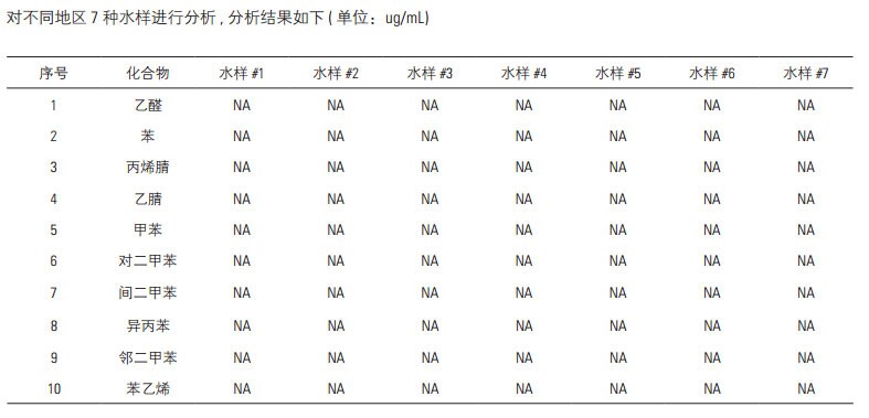 利用建立的分析方法,不同地区的水样中挥发性有机物 进行分析。实验结果表明:本方法能够测定水样中的挥 发性有机物,没有出现色谱峰干扰情况。 同时本实验对加标回收率进行考察。选择某自来水样品,添加混合标准溶液选择高中低三个浓度 ( 表 1 中 level1、3、 5),考察 10 种有机物的加标回收情况。实验结果表明各 组分的加标回收率均在 93.5-106.7% 之间,符合日常分析 检测的要求。对同一样品重复进样 5 针,RSD 处于 0.6- 4.5%,仪器精密度符合检测要求。