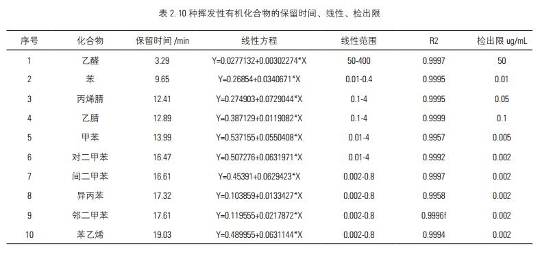 配制浓度范围为:低浓度 0.002-50ug/mL, 高浓度 : 0.4-400 ug/mL 的校准溶液,采用上述方法分别进样分析,考察各组分在 此浓度范围内的线性。实验结果表明 10 种组分在该浓度范围内线性关系良好,线性相关系数均大于0.99(见表1)。 同时以三倍信噪比计算各组分检出限,各组分检出限在 0.002-50 ug/mL 之间(见表 2)。