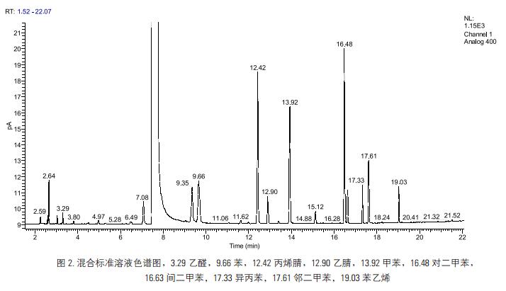 为了既能把待测组分完全分离,同时节省分析时间,提 高分离效率比较了 TG-624,TG-5,TG-Wax 几种毛细管色 谱柱,结果表明 TG-Wax 毛细柱可以将 10 种挥发性有机 物完全分离;通过对初始柱温、程序升温的优化,到 10 标准品色谱图及样品加标色谱图 10 种挥发性有机物准品色谱图见图 2。本方法中水样品 种物质良好的基线分离,达到最终定性定量的目的。气 相色谱分离图见图 2。