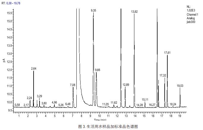 本方法中水样品中无其它物质对所分析物质干扰,如图 3 为生活用水样 品加标准品色谱图。配制标准溶液浓度水平如下表 1.