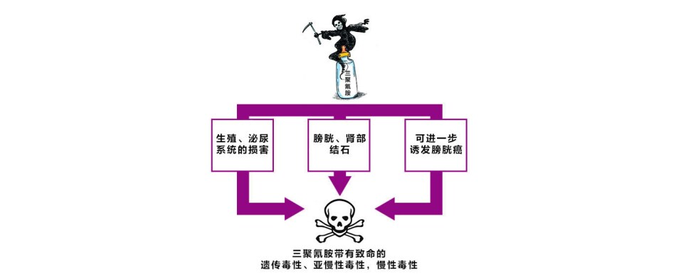 由于三聚氰胺急性毒性试验的半数致死量大于5000mg/kg(LD50,大鼠,经口),所以一般技术人员只看到其“毒性强度:小-极小”,但是,三聚氰胺的遗传毒性、亚慢性毒性,慢性毒性是致命的:动物长期摄入会造成生殖、泌尿系统的损害,膀胱、肾部结石,并可进一步诱发膀胱癌。