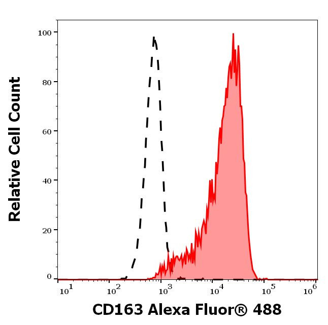 Flow cytometry (surface staining) of CD163 in human peripheral whole blood. Samples were stained with CD163 monoclonal antibody (Product # MA562216) using a dilution of 4 µL reagent/100 µL of peripheral whole blood. Separation of human monocytes (red-filled) from lymphocytes (black-dashed). {{ $ctrl.currentElement.advancedVerification.fullName }} 验证信息 View more