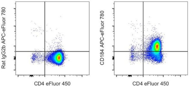 Description: The 2B11 monoclonal antibody reacts with mouse and human CXCR4, also known as CD184, Fusin, LESTR, or HUMSTR. Fusin is a member of the G-protein-coupled chemokine receptor family with seven membrane-spanning domains, and functions as a coreceptor for X4 HIV-1 entry into CD4+ cells. In addition it has been shown to play a role in lymphocyte migration. The ligand for CXCR4 is SDF1. CXCR4 is required for maintenance of granulocyte progenitors in the bone marrow and essential for B cell development. Expression of CXCR4 is different between mice and human. In the thymus CXCR4 is restricted to CD4+CD8+ cells while in the spleen predominant expression is found on B lymphocytes.