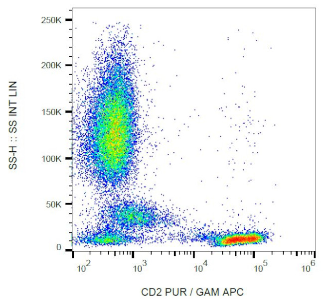 CD2 (LFA-2) is a monomeric surface antigen (MW range 45-58 kDa) of the human T-lymphocyte lineage that is expressed on all peripheral blood T cells. CD2 is one of the earliest T-cell markers, being present on more than 95% of thymocytes and it is also found on some natural killer cells, but not on B lymphocytes. Monoclonal antibodies directed against CD2 inhibit the formation of rosettes with sheep erythrocytes, indicating that CD2 is the erythrocyte receptor or is closely associated with it. The interaction between CD2 and CD58 stabilizes adhesion between T cells and antigen presenting or target cells. Relatively low affinity of CD2 to CD58 (as measured in solution) is compensated within the two-dimensional cell-cell interface to provide tight adhesion. Moreover, T cell activation induces increased CD2 expression and its lateral mobility, making easier contact between CD2 and CD58. Subsequently, T cell activation causes fixation of CD58-CD2 at sites of cell-cell contact, thereby strengthening intercellular adhesion. CD2 deficiency reduces intestinal inflammation and helps to control infection. Diseases associated with CD2 dysfunction include penis squamous cell carcinoma and immune deficiency due to the absence of the thymus.