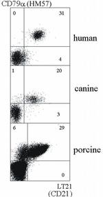 This antibody reacts with an extracellular epitope of CD21 (CR2), a 145 kDa transmembrane glycoprotein (complement C3d receptor - C3dR) expressed on B lymphocytes, follicular dendritic cells, some epithelial cells and a subsets of T lymphocytes. It is not expressed on immature B cells.