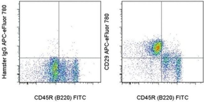 Description: The eBioHMb1-1 monoclonal antibody reacts with mouse and rat CD29 (integrin beta 1), a 110-120 kDa member of the beta integrin family expressed by leukocytes, endothelial, smooth muscle and epithelial cells. CD29 binds non-covalently with the alpha integrins CD49a-f to form the VLA-1 through VLA-6 complexes, as well as with CD51. These alpha-beta integrin heterodimers are capable of mediating a variety of cellular responses including adhesion, trafficking, proliferaton and differentiation. All integrins which include CD29 bind to extracellular matrix proteins including collagen, laminin, fibronectin and vitronectin, whereas some CD29-containing integrins can also interact with cellular receptors such as VCAM-1 and MadCAM-1.